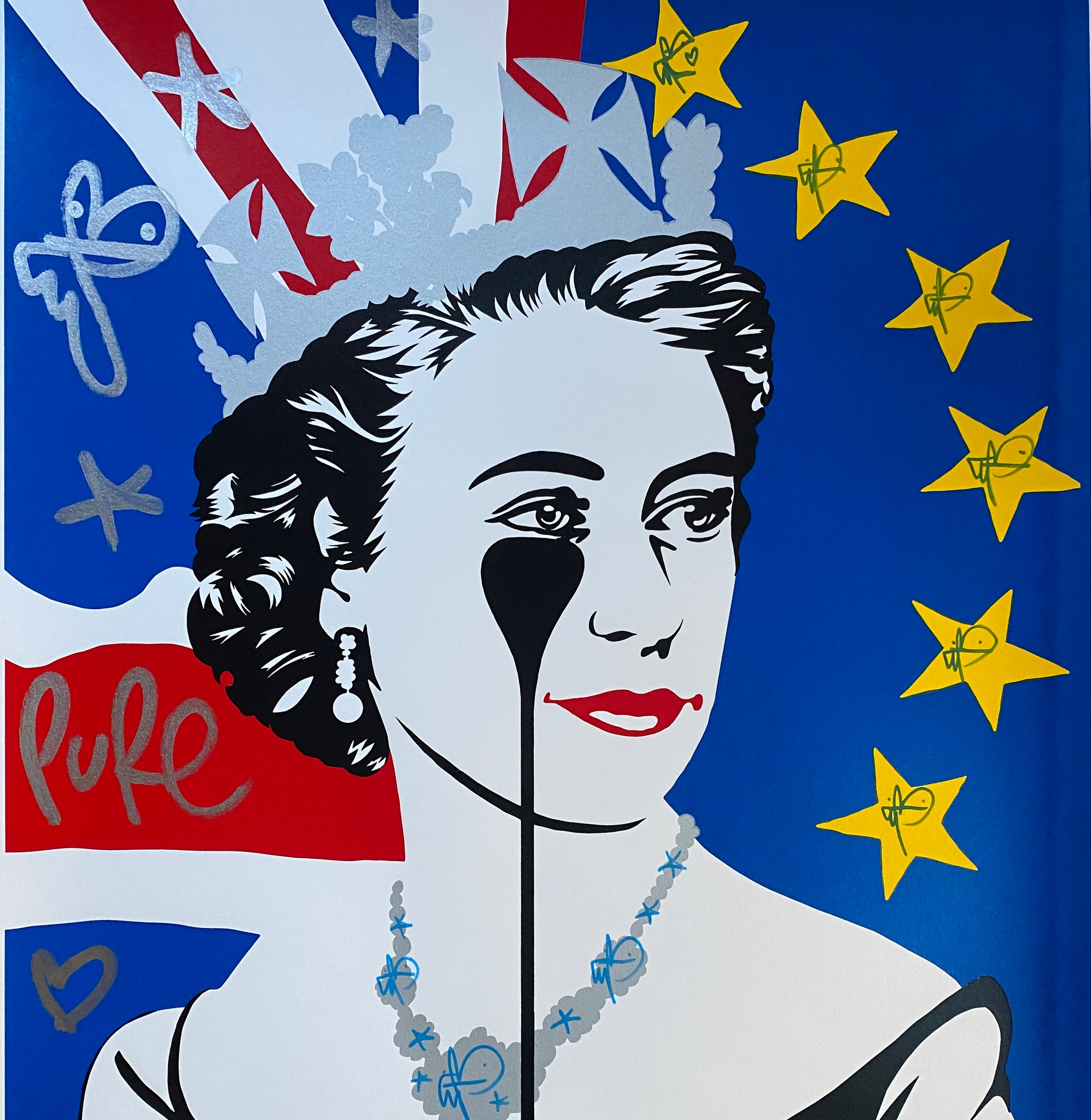 Pure Evil explains that a chance email from a Chinese “copy village” gave impetus to his “Nightmare Series.” The village offered, via email, a list of artists it could reproduce, including three Andy Warhol paintings. The idea of Warhol’s entire artistic output distilled right down to three small 64 x64 pixel thumbnails of Jackie Kennedy, Liz Taylor and an Electric Chair became the inspiration for these doomed and dripping celebrity portraits. Why are they crying ? “Its an illustration of the heartbreak and sadness we have all experienced in relationships in the past.”